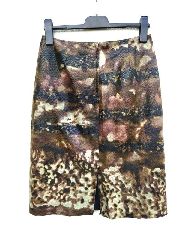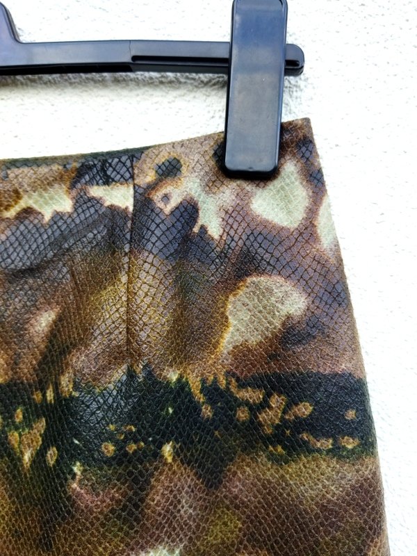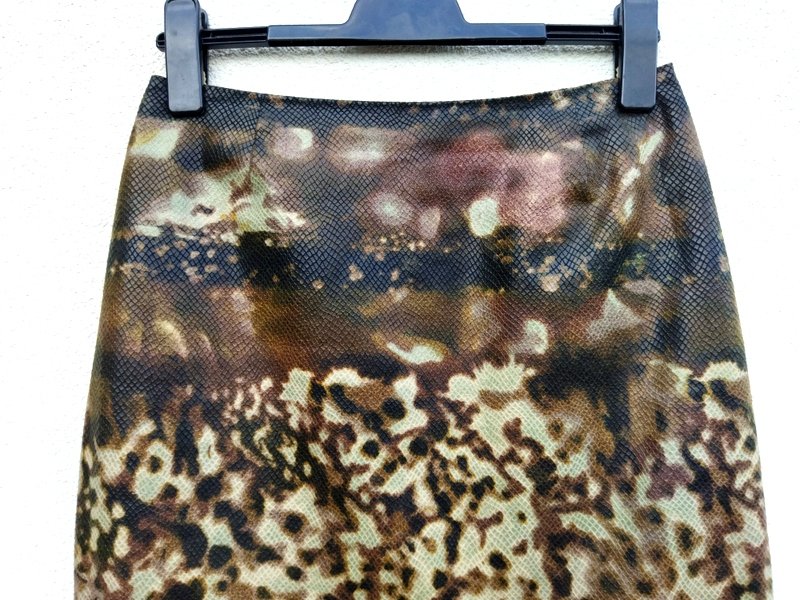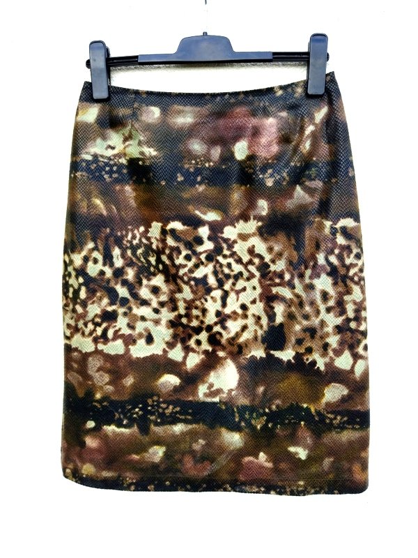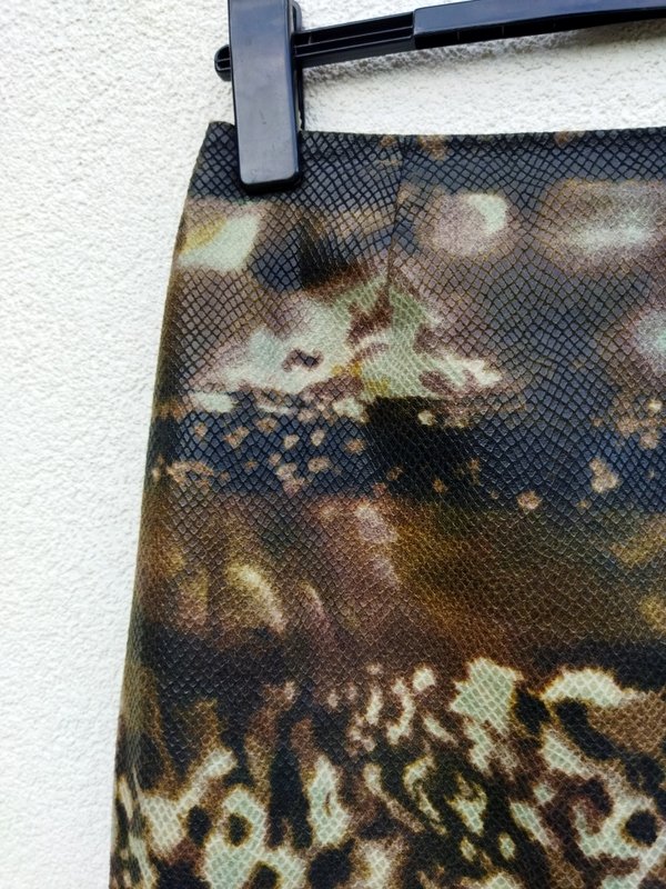 Ołówkowa spódnica z tkaniny imitującej skórę węża boa w kolorystyce brązu , czerni, beżu, jasnej i zgniłej zieleni. Zapinana z tyłu na zamek . z krytym rozcięciem u dołu. Na podszewce