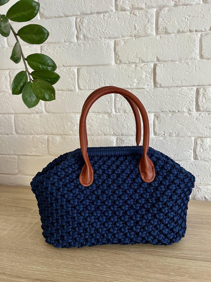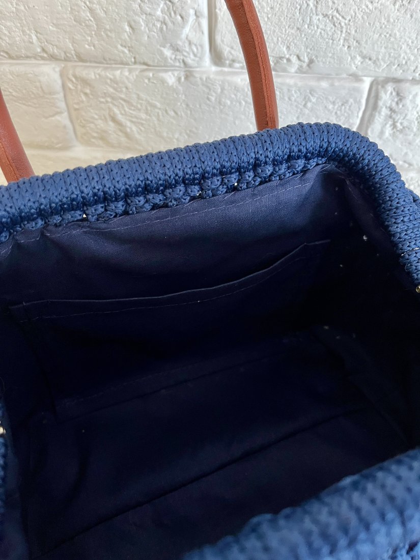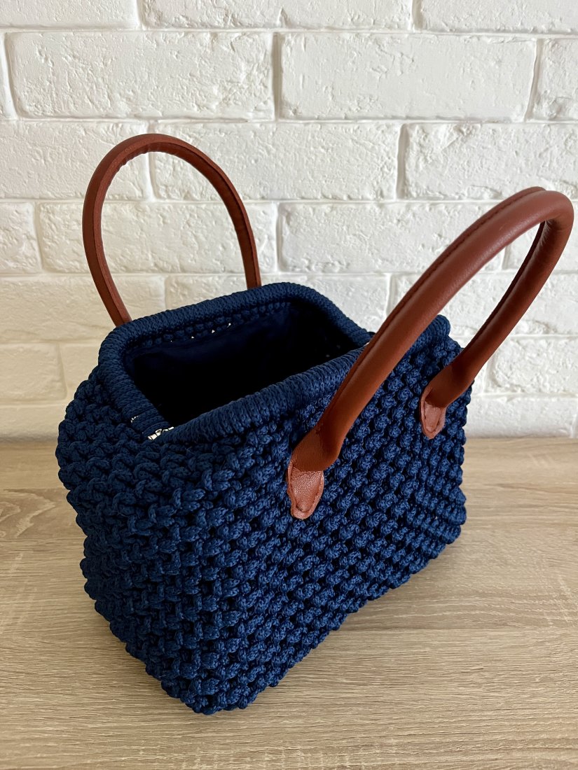 Prosta forma, głęboki granat i kontrastujące rączki w karmelowym odcieniu tworzą elegancką, uniwersalną całość. Ręczne wykonanie i wyrazista faktura splotu podkreślają rzemieślniczy charakter torebki. Torebka powstała z wysokiej jakości sznurka , z dbałością o detale, wnętrze jest wykończone bawełnianą podszewką z kieszonką na drobiazgi.