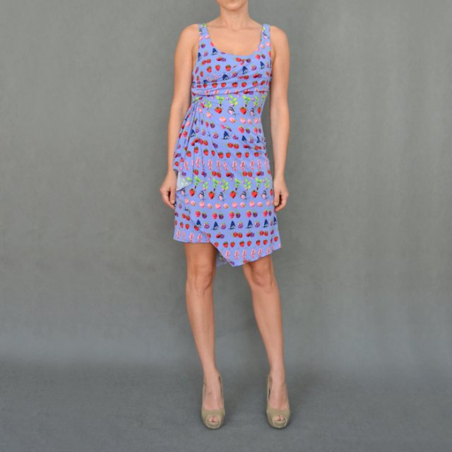 Wyjątkowa, słodka sukieneczka w malinki, truskawki, motylki i kwiatuszki. Tu przedłużona, tam drapowana - dużo się na niej dzieje. Materiał stylizowany na vintage. Versace for H&M.