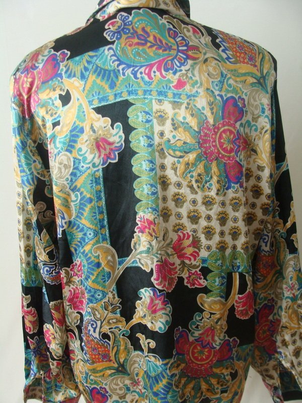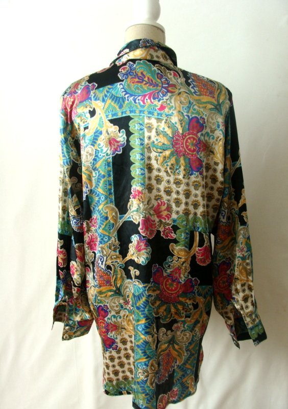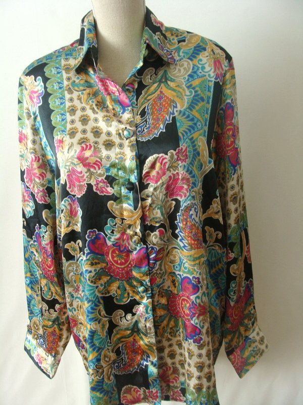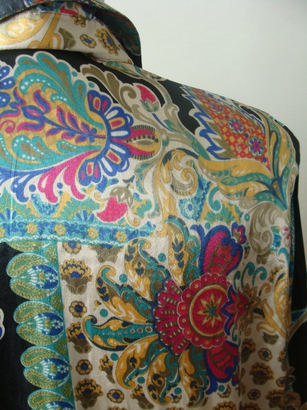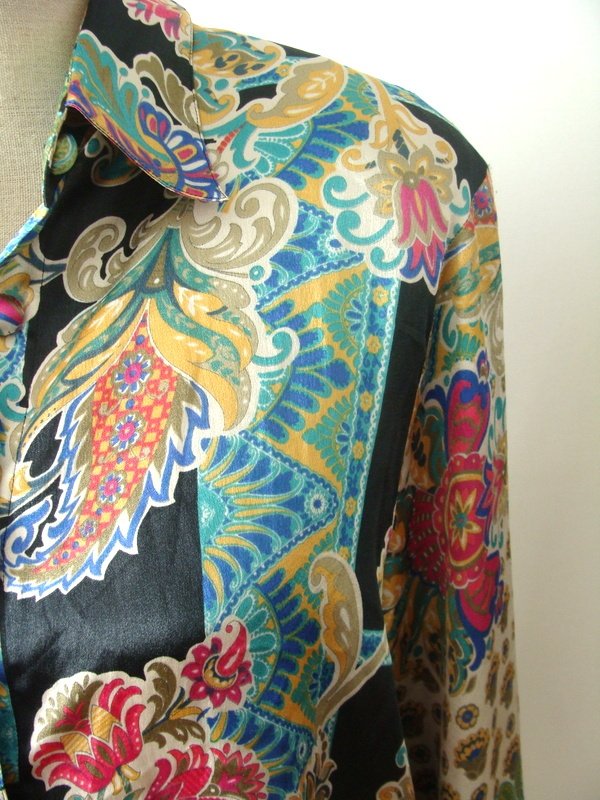 Wzorzysta, koszulowa bluzka z milutkiej w dotyku jak jedwab poliestrowej tkaniny w żywej kolorystyce. Zapinana na obciągane tkaniną guziki ( jeden w zapasie), z kołnierzykiem na małej stójce. Asymetryczna - przód krótszy od tyłu, boki zaokrąglone. Ładniejsza w realu.