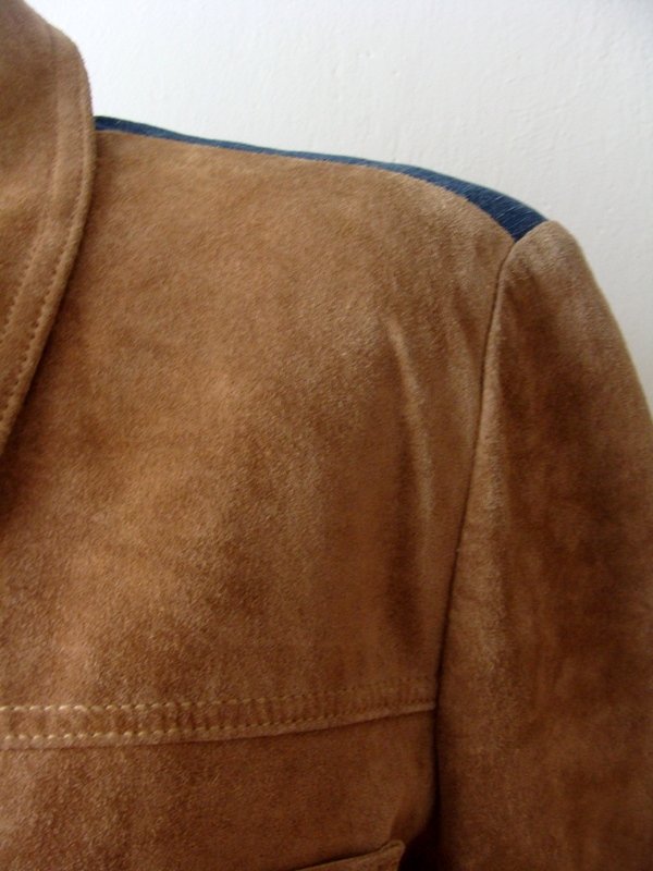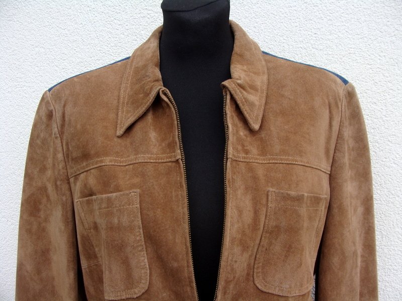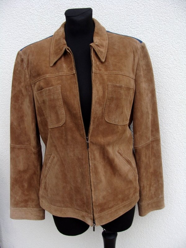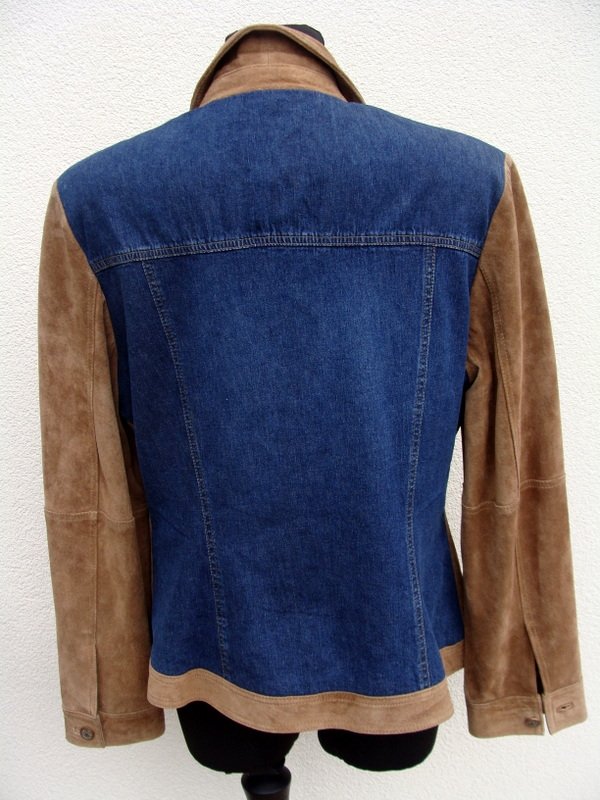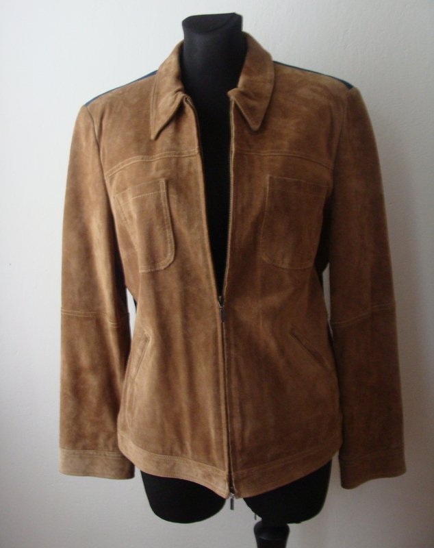 Kurtka z łączonych materiałów ; zamszowej skóry naturalnej w brązowym kolorze i i ciemnoniebieskiego jeansu. Z kołnierzem , z dwiema wpuszczanymi kieszeniami z zamkami. Zapinana na zamek. Całość na podszewce.