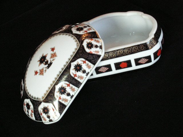 Ogromne puzdro ze szlachetnej białej porcelany, sygnowane Crown Staffordshire, z orientalizującej serii powtarzającej japoński wzór IMARI.. Intrygująca elegancja kolorystyczna misternego kwiatowego wzoru. Ciekawy kształt. Doskonała ozdoba do buduaru, na toaletkę lub do łazienki... 15,5 x 12 x 9,5 cm. Stan zachowania bardzo dobry minus kropeczka wgłębienia w szkliwie na wieku.
