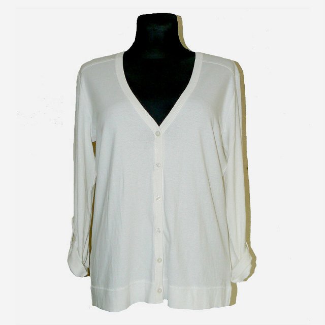 Klasyczny biały kardigan renomowanej marki Via Appia. Uszyty z wysokiej jakości miękkiej bawełny. Rękawy z możliwością podwinięcia i podpięcia guzikami.