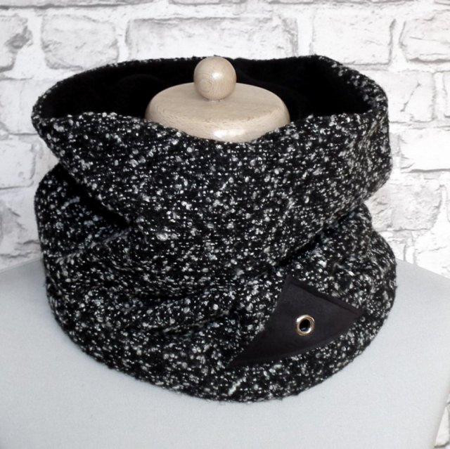 Elegancki, uniwersalny, modny, niezwykle praktyczny i ciepły dodatek. Dwustronny komin uszyty z doskonałej tkaniny wełnianej w odcieniach czerni i bieli- tzw. ''sól i pieprz'' oraz miłej dla skóry dzianiny o wyglądzie wełny w kolorze czarnym. Tkanina wewnętrzna czarna jest bardzo przyjazna dla skóry, miła w dotyku i puszysta. Dodatkową ozdobą jest trójkątny emblemat z imitacji zamszu, ze srebrnym nitem. 100% zadowolenia nawet dla wymagającego ''modowo'' faceta.