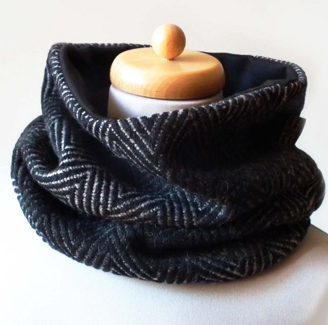 Unikatowy, modny, cieplutki, przyjemny dla skóry komin, szal-koło, tuba, z pięknego, grubego dżerseju w klasycznych kolorach. Szal uszyty z dwóch warstw- z jednej strony dżersej grafitowy melanż, z drugiej wzorzysty. Można owinąć dwukrotnie wokół szyi.