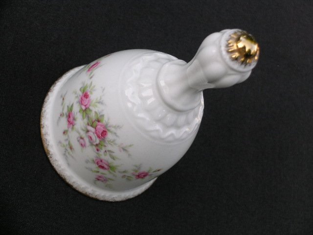 Szlachetnie porcelanowy, przeuroczo romantycznie i delikatnie a bogato zdobiony dzwonek jadalniano-celebracyjny. Odtworzenie wiktoriańskiej urody, zdobne ryflowanie i złocenia w dawnym stylu z charakterystycznym rozkropkowaniem. Na błyszcząco szkliwiony. Serce dzwonka jakościowo przemyślane, także do osobistej zmiany, ze szklanym szlachetnym koralikiem. Pięknie dźwięczy :) 7 x 12 (rączka 2,5) cm. Stan zachowania bardzo dobry. Szlachetna perełka wśród dzwonków !