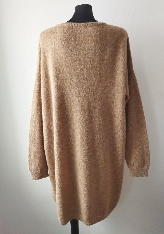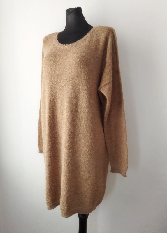 Dzianinowa sukienka o dobrym składzie jakościowym w melanżowym tabaczkowym kolorze. Minimalistyczny krój z owalnym dekoltem, z niżej wszywanymi rękawami. Wykończona ściągaczami.