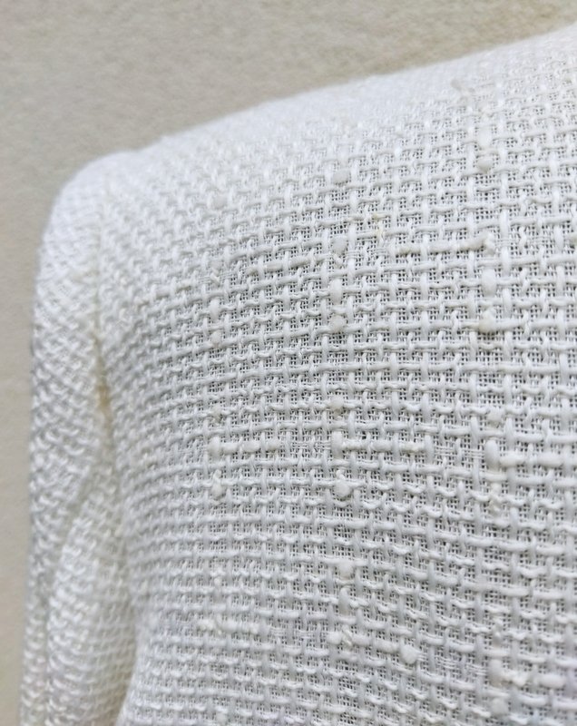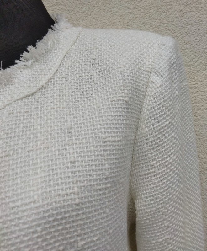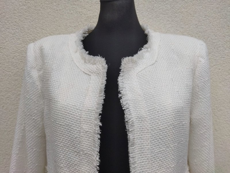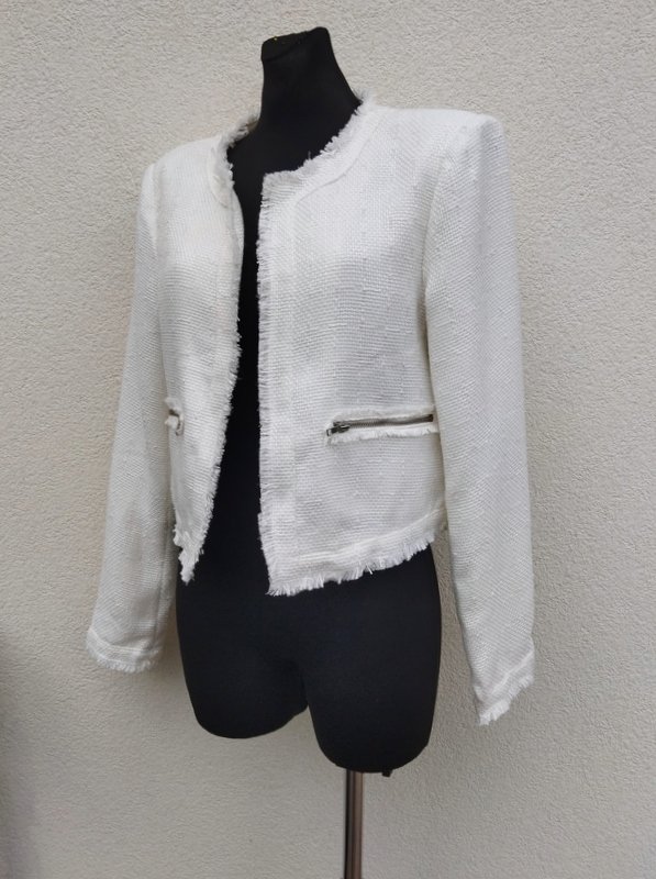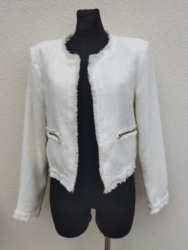 Elegancka marynarka lub krótka kurtka z tkaniny z wyrazistą fakturą przeplatanki, wykończona frędzelkami wyciąganymi z tkaniny. Fason otwarty , Bez kołnierza, z dwiema kieszeniami z zamkami. Na podszewce. Ładniejsza w realu.