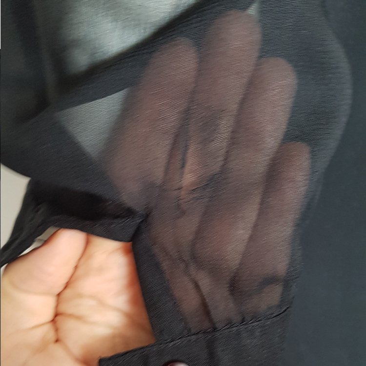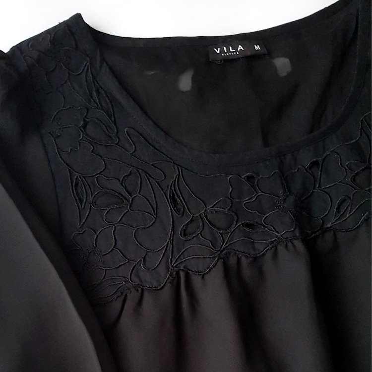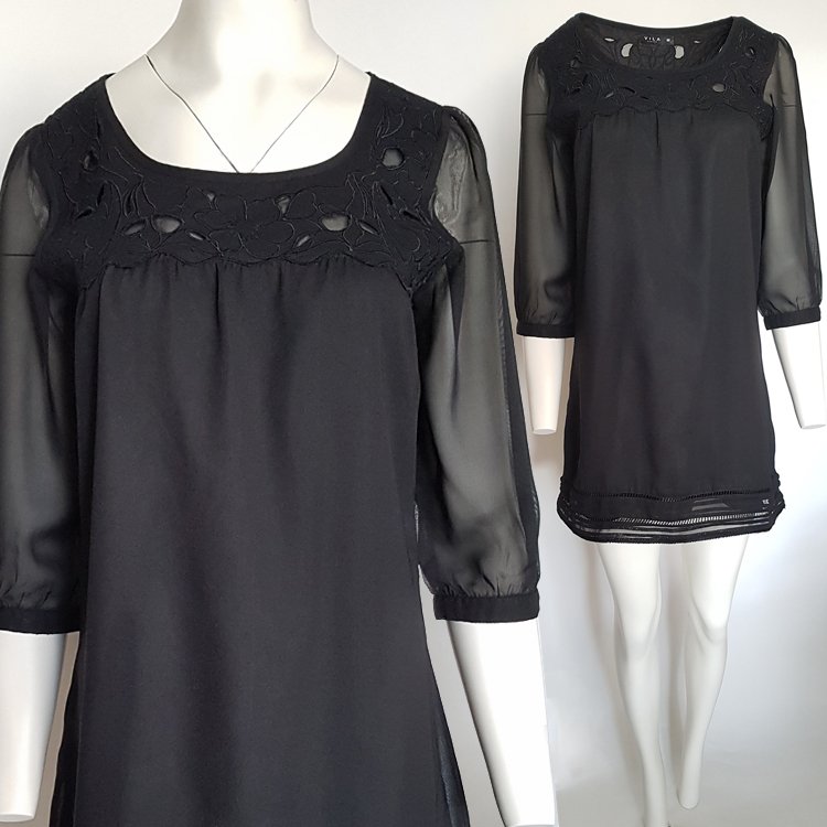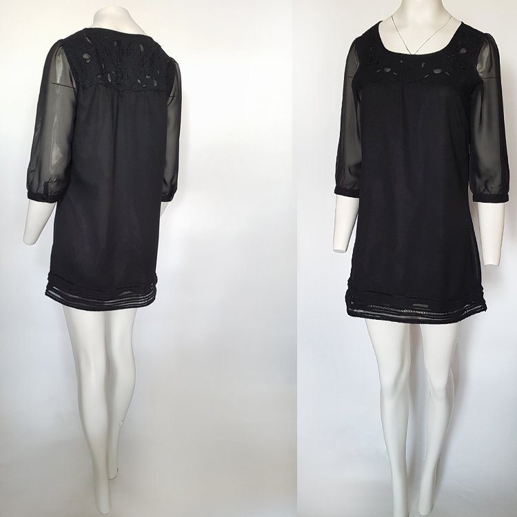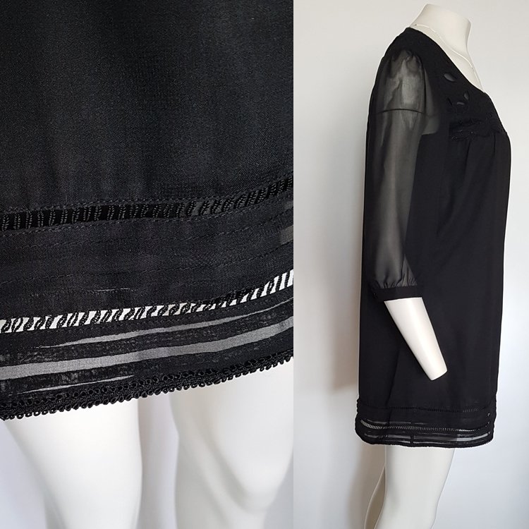 Tunika / mini sukienka z szyfonu z haftowaną wstawką u góry. Dekolt okrągły, rękawy bufiaste, długość 3/4, zakończone wąskim mankietem, zapinanym na guziki. Korpus sukienki na podszewce.