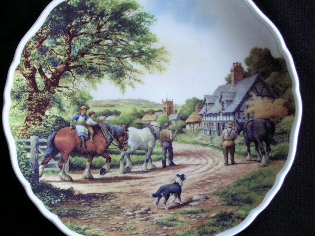 Dekoracyjny porcelanowy talerz sygnowany najwyższą jakością ROYAL DOULTON , z kolekcjonerskiej serii Village Life autorstwa Anthony Forstera z pięknymi, drobiazgowymi narracyjnymi ilustracjami. Przyjemna kolorystyka i wysoka jakość malatury.Rant ozdobny, nieco falbankowy. Edycja z 1993 roku.