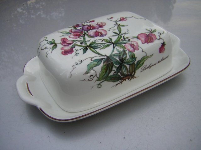 Rzadko spotyka rzecz z popularnej serii BOTANICA. SYGNOWANA VILLEROY & BOCH LUXEMBOURG BOTANICA VITRO PORCELAINE DISHWASHER, MICROWAVE SAFE. Mocna, szlachetna, dźwięcząca porcelana. Imponująca forma na dużą kostkę masła. ...na ser też się sprawdzi....naprawdę duża jest ; ) Poręczne uchwyty, wyodrębnione podniesionym rantem miejsce na masło. Ciepło Biała porcelana, błyszczące wykończenie. Subtelne, ciepło brązowe wykończenie rantu podstawy. Rant przykrywki tylko formą uwypuklony. Przepiękny, bogaty wzór kwiatowy na przykrywce. LATHYRUS TUBEROSUS. GROSZEK PACHNĄCY jak żywy, w radosnych, miłych dla oka barwach.