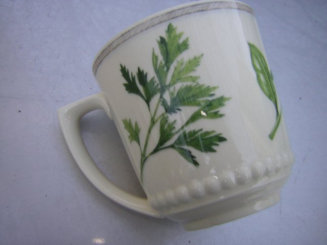 Duży porcelanowy kubek. Na pewno mieści się pół litra ;) Sygnowany Villeroy&Boch Switch coffee house London fajance germany. Ciekawa forma z oryginalnym , dużym uchem. Na dole ozdobne wypukłe kuleczki i wyraźnie czytelny rant. Zdobienie ziołowe, oszczędne w naturalnych barwach na tle w kolorze jasno kremowym. Wykończenie satynowo - błyszczące. Mocny, ale nie ciężki. Pojemny, fantastyczny.