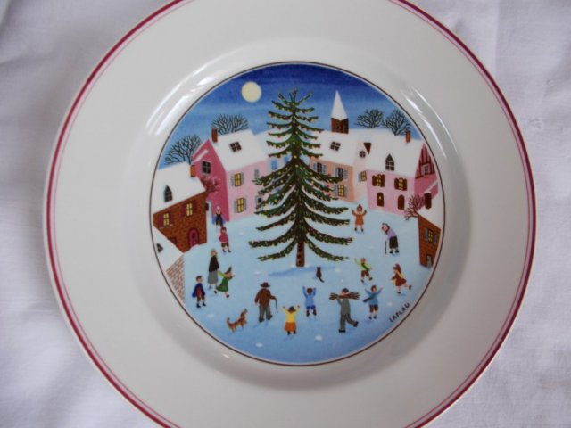 Wyjatkowej urody i jakości PORCELANOWY TALERZ sygnowany VILLEROY & BOCH z serii NAIF. Ancienne Manufacture Imperiale et Royale Luxembourg NAIF CHRISTMAS VITRO - Porcelaine Dishwasher safe. Porcelana dzwięcząca, mocna,solidna w kolorze ciepłej bieli na błyszcząco wykończona.Rant delikatną czarną kreską podkreślony. Sielankowa scenka zimowa w bardzo ciekawych kolorach. Idzieci i babcia, piesek i kotek....cudo ;) Napis Laplau bez numeru.
