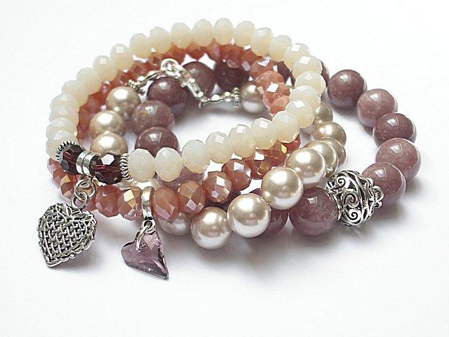 PROJEKT AUTORSKI. WSZELKIE INNE PODOBNE MODELE TO KOPIE NARUSZAJĄCE PRAWA AUTORSKIE. Komplet czterech bransoletek wykonanych z naturalnych kamieni: duże kule kwarców [12mm] ,perły Majorka [10mm] , krysztalków [8 x 6mm], przywieszki z kryształkiem Swarovskiego serce oraz elementów metalowych w kolorze srebra. Bransoletki pasują na nadgarstek 16-17cm. Biżuteria ozdobnie zapakowana