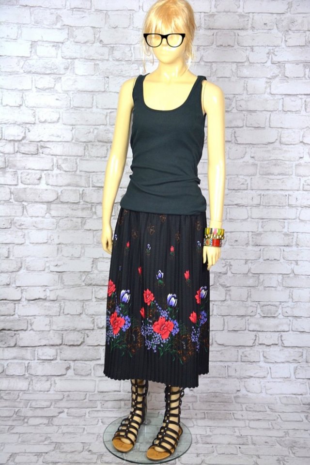 Spódnica vintage o długości do około połowy łydki utrzymana w czerwone kwiaty na czarnym tle, w pasie na gumie, wykonana z delikatnie elastycznej , plisowanej tkaniny o deliaktnie sprasowanym splocie.Fason poszerzany.