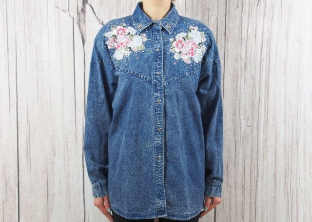 Koszula vintage z kwiatami i dżetami na przedzie. Zapinana na guziki. Materiał: jeans.