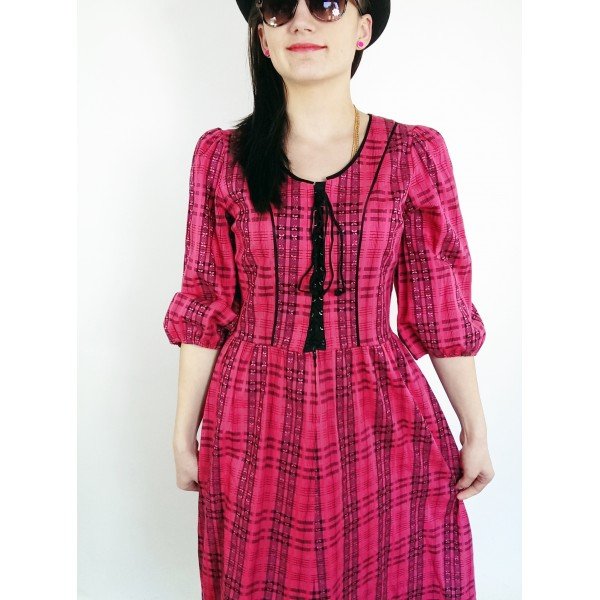 Sukienka różowo-czarna w kratę, wiązana i zapinana na ekspres z przodu.