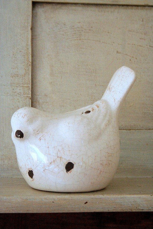 Ciekawy ceramiczny duży ptaszek. W kolorze ecru z celowymi przetarciami i spękaniami. W pozycji siedzącej:)