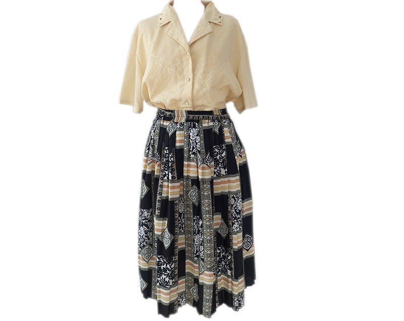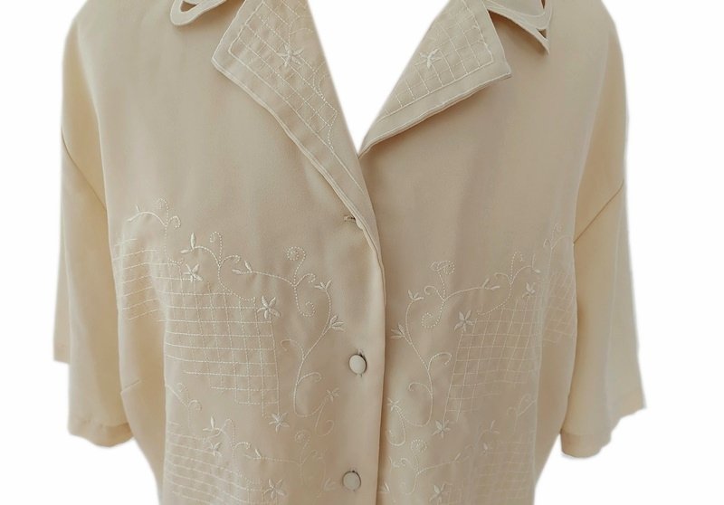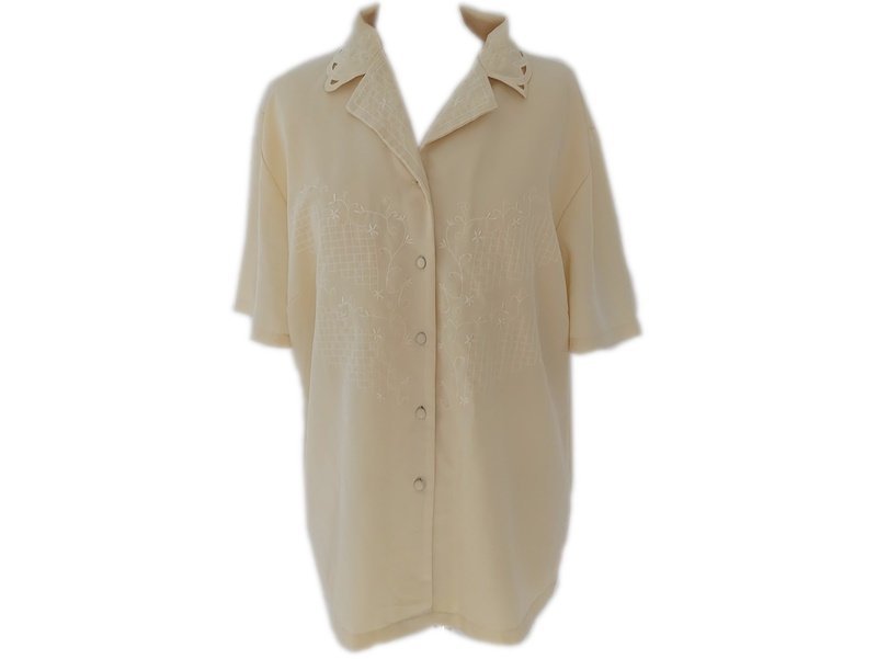 Bluzka vintage w delikatnym, przygaszonym żółtym kolorze, ozdobiona uroczym haftem typowym dla klasycznych modeli z minionych lat. Idealna dla miłośniczek oversize’owych krojów. Świetnie wygląda zarówno ze spódnicą, jak i ze spodniami.