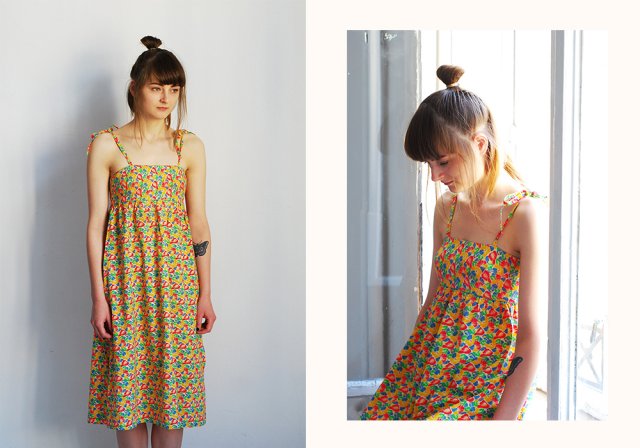 Dziewczęca sukienka w słonecznych kolorach. Uszyta z grubszej bawełny, może służyć nie tylko podczas lata.