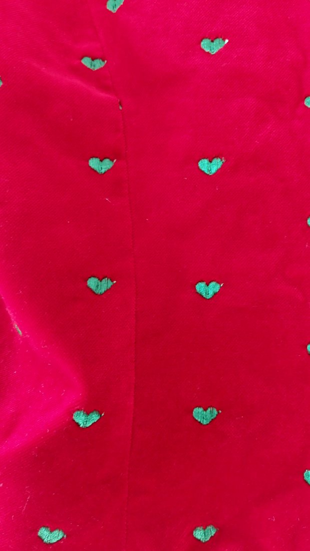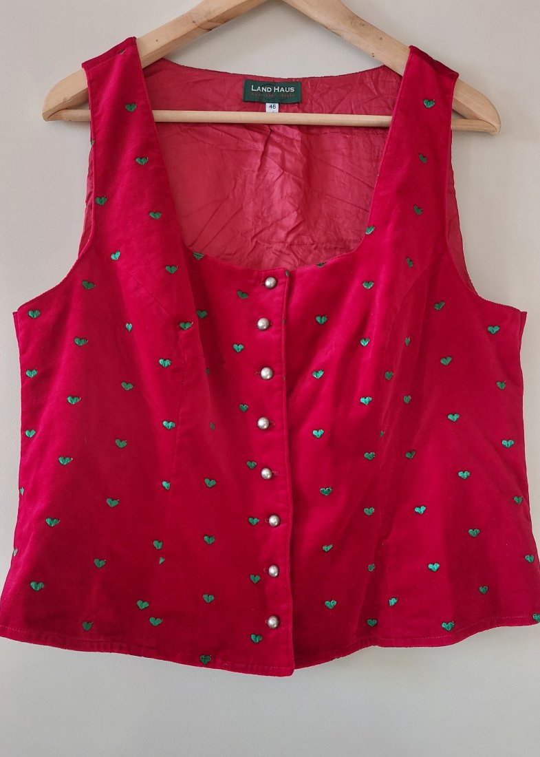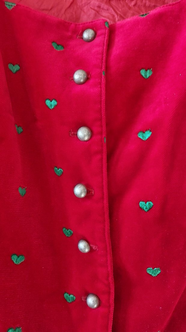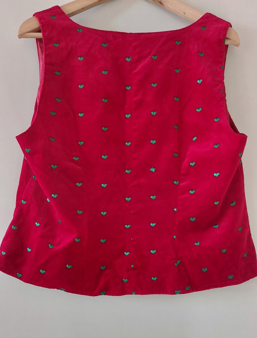 Kamizelka w ludowym stylu wykonana z czerwonego aksamitu, ozdobiona małymi, haftowanymi sercami.