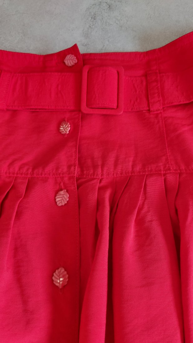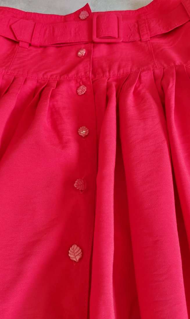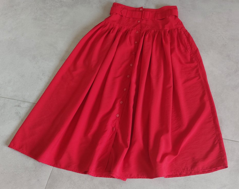 Spódnica vintage zachowana w bardzo dobrym stanie. Rozmiar 38. Stan: ślady użytkowania widoczne na pasku. Długość 83 cm, pas 36 cm. Skład: wiskoza 70%, poliamid 30%.