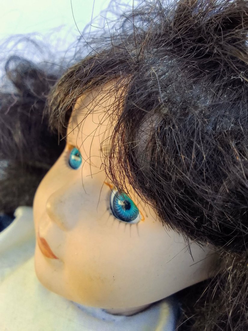 Wyjątkowa lalka retro o klasycznej estetyce, łącząca elegancję i nostalgiczny urok dawnych zabawek. Jej głowa i kończyny wykonane z ceramiki, natomiast tułów z miękkiej tkaniny, co nadaje jej subtelnej formy. Charakterystyczne szklane oczy w pięknym odcieniu niebieskim oraz długie brązowe włosy przyciągają uwagę i podkreślają jej indywidualny wygląd.