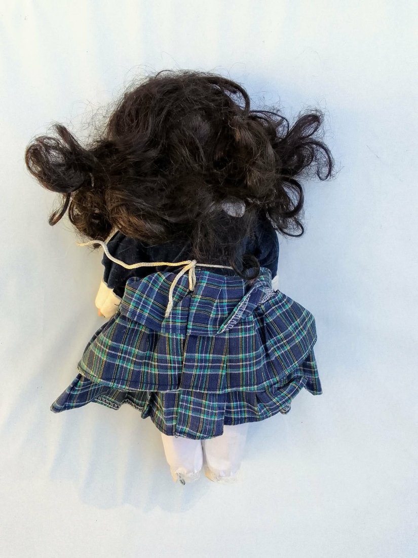 Urocza lalka w stylu retro / vintage, o wysokości ok. 33 cm, łącząca klasyczne materiały: ceramiczne części (głowa, ręce, nogi) oraz szmaciany tułów. Wyjątkowy detal stanowią szklane oczy o niebieskich tęczówkach oraz długie brązowe włosy, które można delikatnie czesać i układać.
