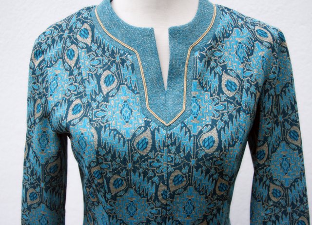 Angielska sukienka złoto-turkusowa formy DL BARRON