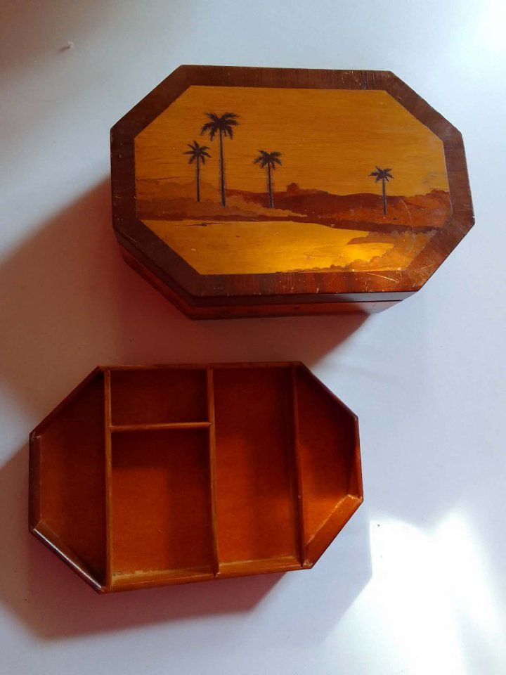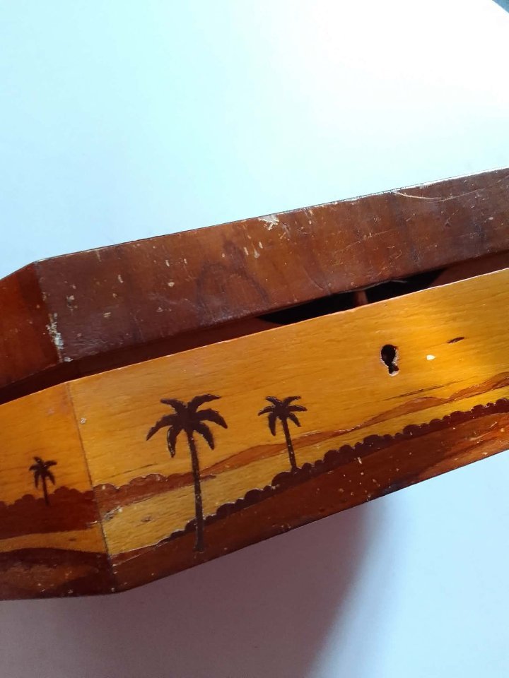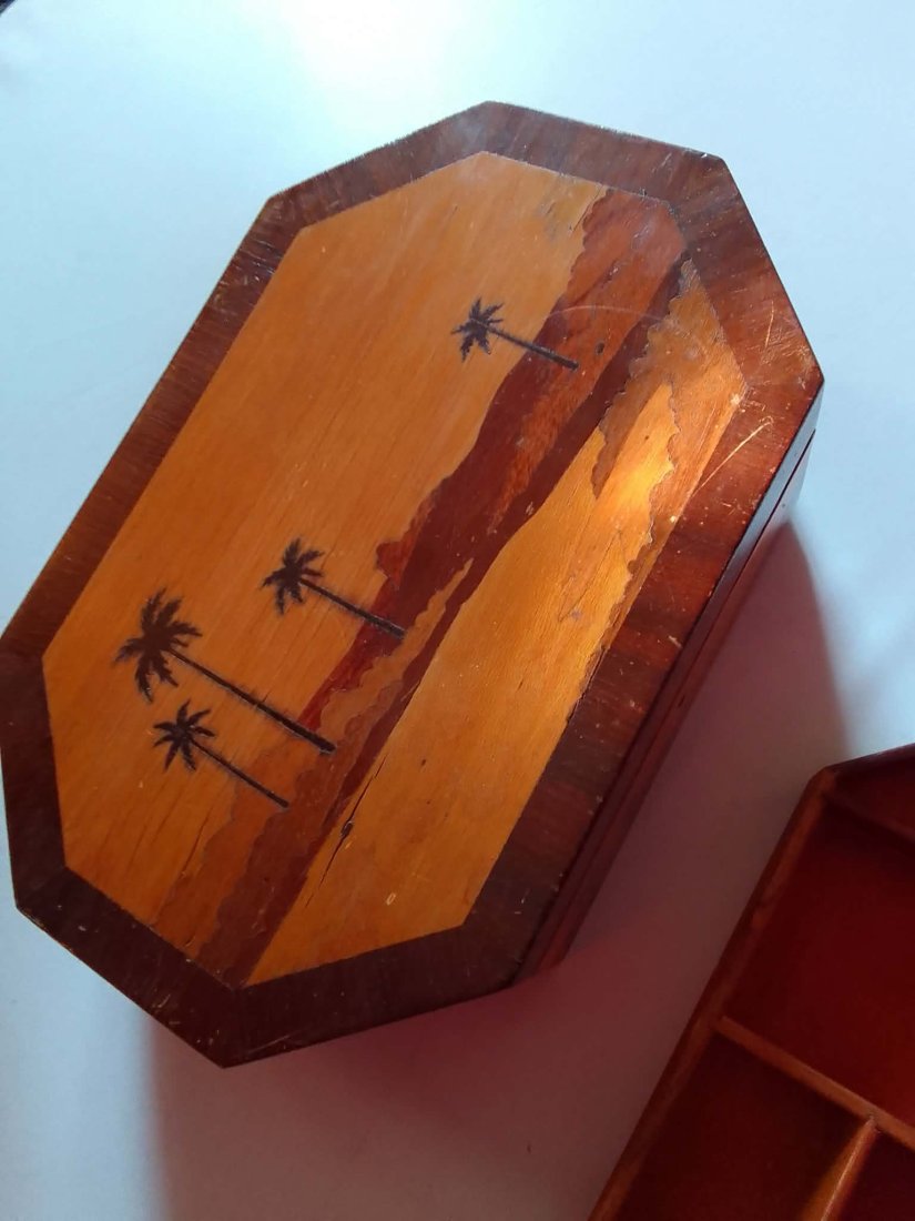 Szkatułka wykonana jest z różnych gatunków drewna z dekoracyjnym fornirowaniem / intarsją, tworzącą geometryczną kompozycję oraz motyw palm. Charakterystycznym elementem jest wewnętrzna konstrukcja z małą szufladką (pięterkiem) do przechowywania drobnej biżuterii lub pamiątek.