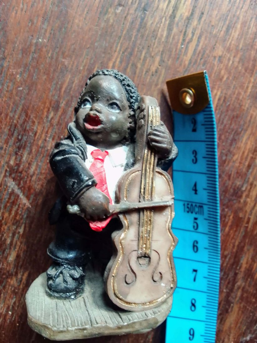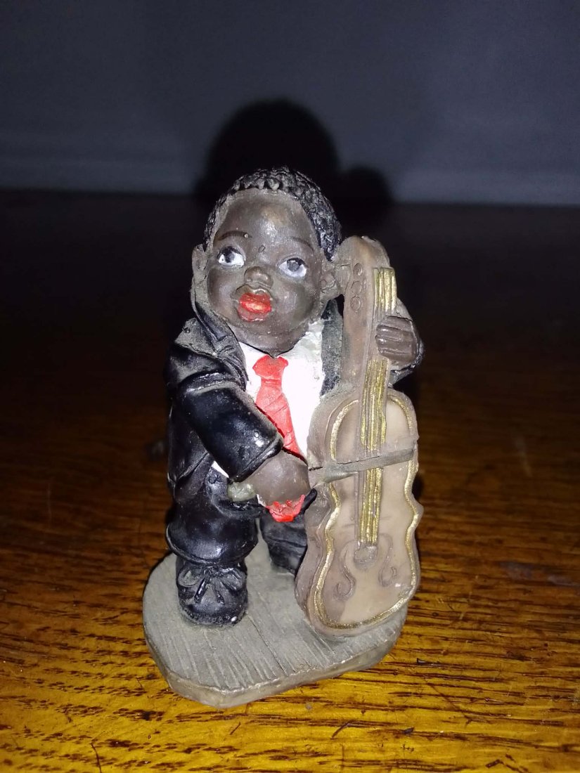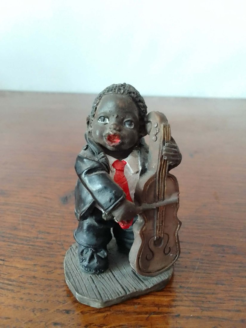 Kolekcjonerska figurka przedstawiająca afroamerykańskiego muzyka jazzowego grającego na kontrabasie. Przedmiot wykonany w stylistyce vintage, nawiązującej do kultury muzycznej Nowego Orleanu, często spotykany jako element większych zestawów orkiestrowych.