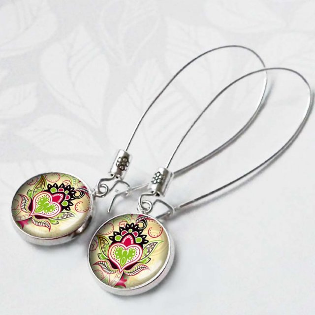 Kolczyki wiszące z oryginalną grafiką, zatopioną pod wypukłym szkiełkiem i oprawioną w bazę w kolorze srebra. Grafika jest najwyższej jakości, wyraźna i nasycona. Bigle hipoalergiczne, zapinane posrebrzane. Oryginalne kaboszony- wykonane ręcznie według mojego projektu i przeze mnie, z dbałością o każdy detal.