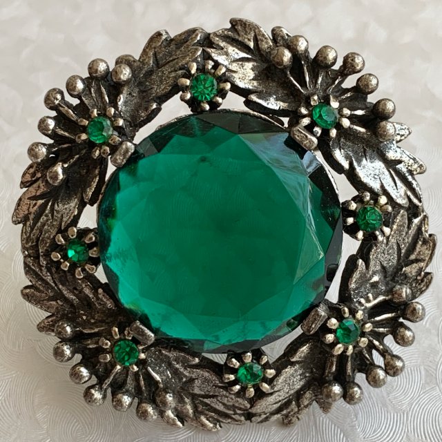 Vintage Green Glass Brooch ❤ Broszka, lata 50-te XXw. ❤ Bardzo ciekawa w starym wydaniu duża brosza. Mocna i ciężka, porządnie wykonana. Datowana na lata 50-te XXw. Ażurowa, wykonana z cyny i wysadzana szklanymi kryształkami o pięknej barwie butelkowej zieleni.