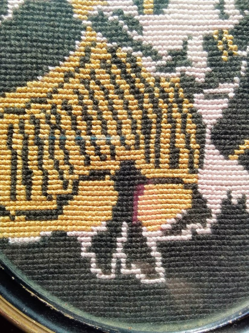 Technika: Precyzyjny haft krzyżykowy (rękodzieło). Użycie kontrastowej palety barw (czerń, odcienie żółci i różu) sprawia, że postacie są wyraźne i dynamiczne.