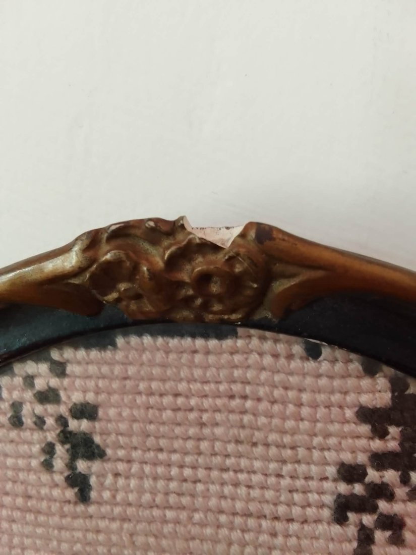 Oprawa: Obraz umieszczony za szkłem w efektownej, owalnej ramie z tworzywa lub metalu, zdobionej florystycznymi ornamentami (różami) w punktach centralnych.