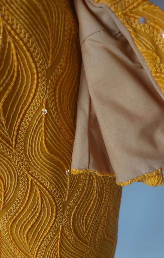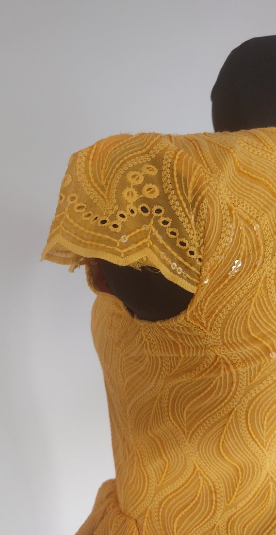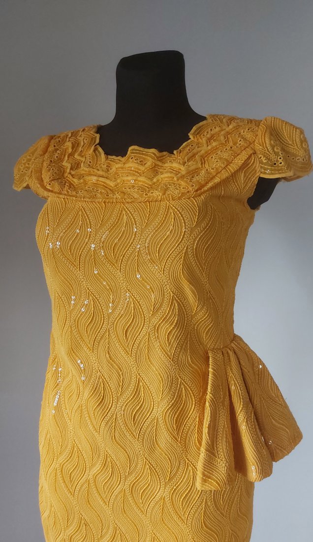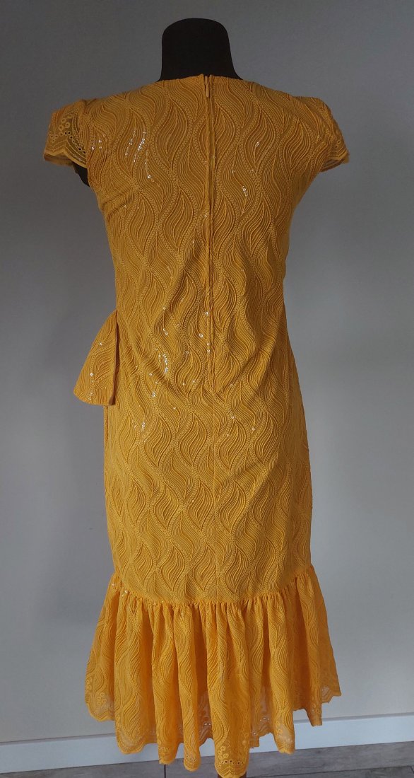 Sukienka uszyta na miarę w bardzo dobrym stanie, sugerowany rozmiar S. Wewnątrz, po bokach pozostawiono zapas materiału.