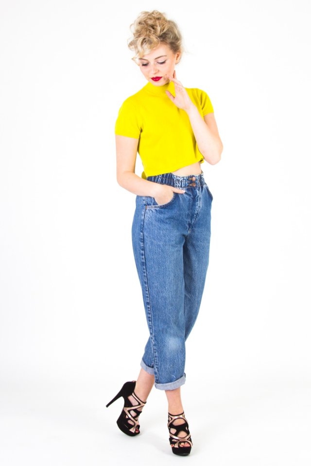 Jeansowe spodnie vintage z wysokim stanem zapinane na zamek i guziki, nogawka zwężana ku dołowi. Spodnie posiadają kieszenie z przodu. Można je regulować w pasie.