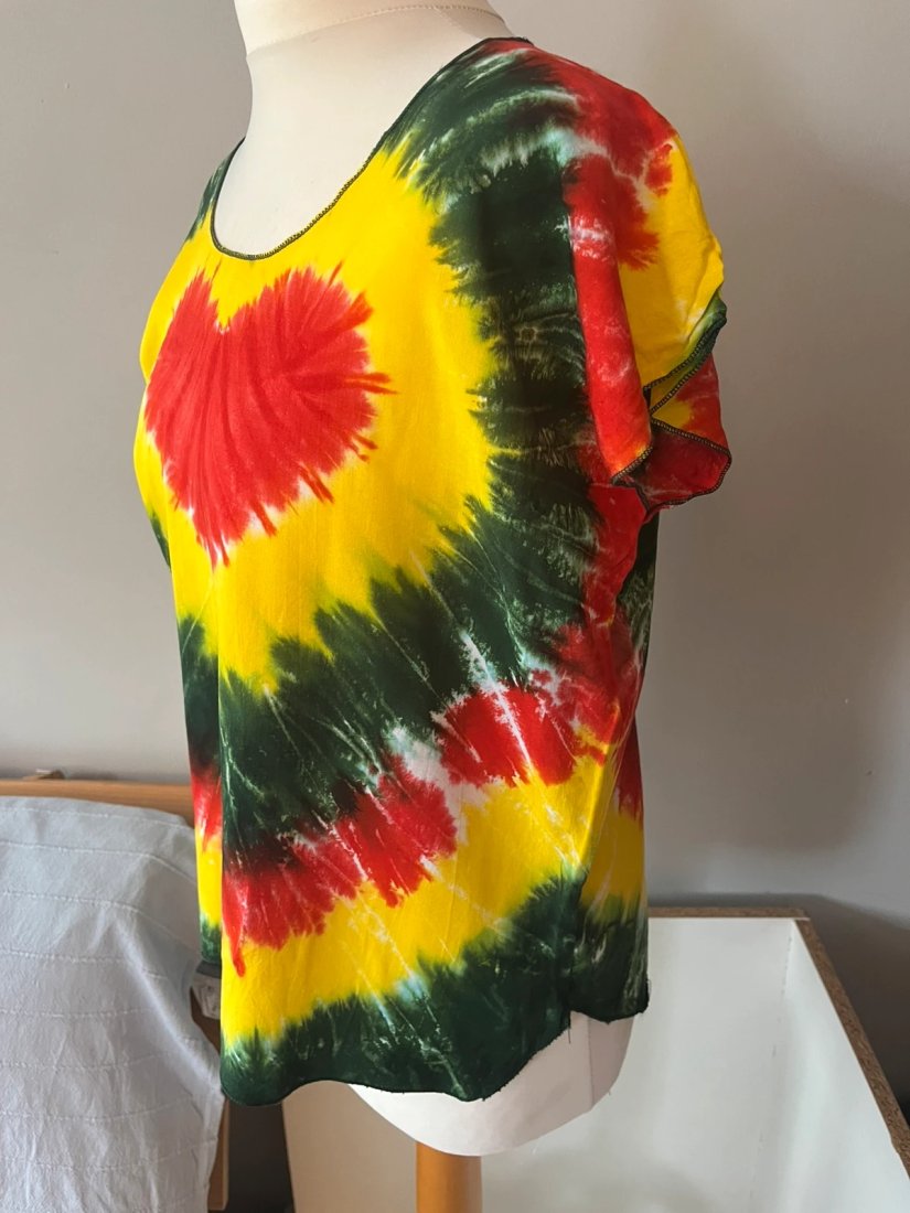 Ręcznie farbowana koszulka typu tie-dye w intensywnych kolorach czerwieni, żółci i zieleni z motywem serca z przodu i z tyłu. Styl inspirowany klimatem reggae, festiwalami i stylem hippie. Przewiewna, luźna, idealna na lato! ???? Szerokość pod pachami: 55 cm ???? Długość całkowita: 69 cm ???? Materiał: cienka, lekka bawełna ???? Stan: 10/10 – jak nowa ✨ Kolorystyka: rasta / jamajska / hippie ???? Rozmiar: oversize S/M/L EN: Hand-dyed tie-dye t-shirt in vivid red, yellow and green colors with a heart motif front and back. Reggae-inspired, airy and soft – perfect for festivals, travel or summer days. ???? Armpit to armpit: 55 cm ???? Length: 69 cm ???? Size: loose fit S/M/L ???? Condition: 10/10 – excellent ???? Fabric: thin soft cotton, handmade look