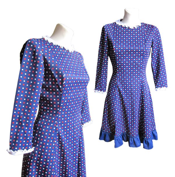 Unikat. Sukienka z lat 70-80 tych. Tkanina syntetyczna. Kropki, falbanki i białe wykończenie. Rozmiar 36. Wymiary rzeczywiste: biust 80 cm, pas 64-66 cm, dł. rękawa 48 cm, dł. całkowita 95 cm. Stan: db! RZECZ NIE POCHODZI Z SECONDHANDU. W razie pytań, proszę o kontakt.