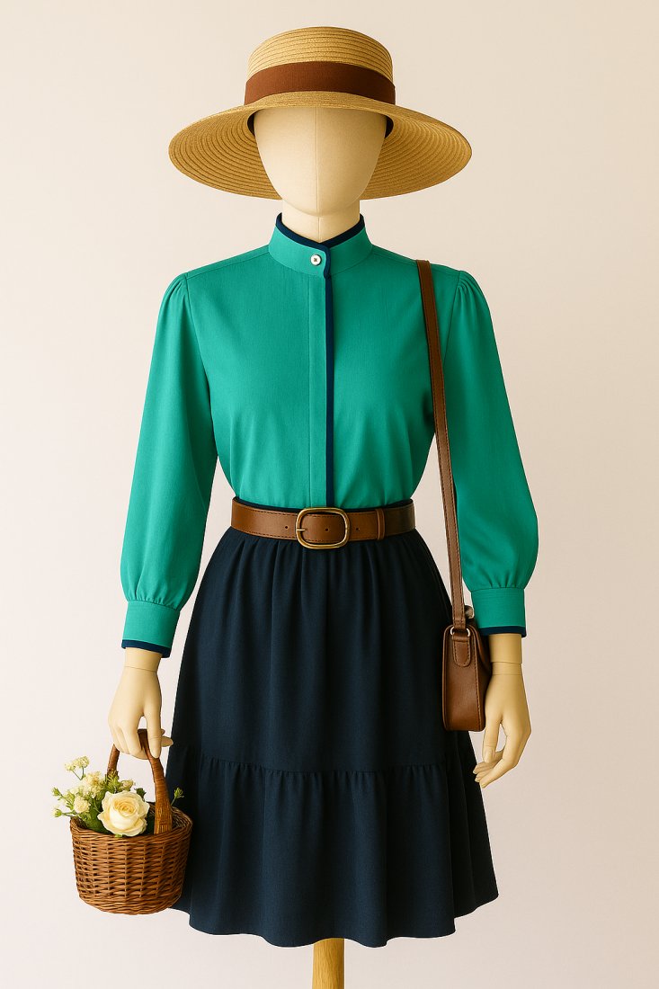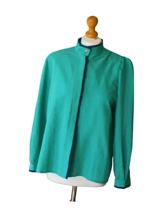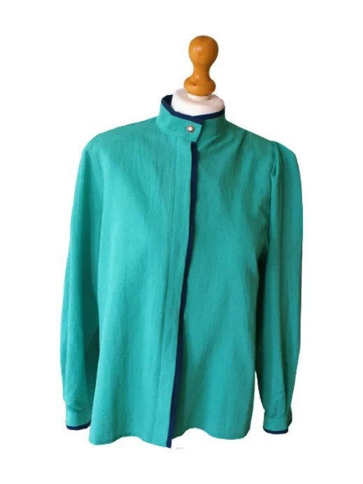 Vintage zielona bluzka damska marki Rio z lat 80. Klasyczny retro fason z poduszkami na ramionach, stojącym kołnierzem i dekoracyjnymi granatowymi wykończeniami. Zapinana na guziki z przodu, z długim rękawem. Idealna jako bluzka biurowa, w stylu oversize lub do stylizacji retro.