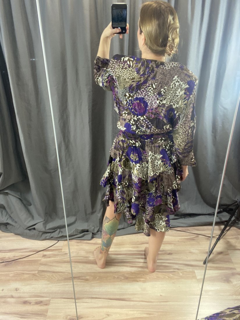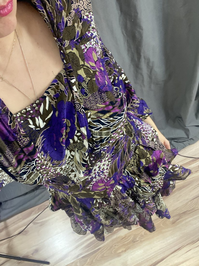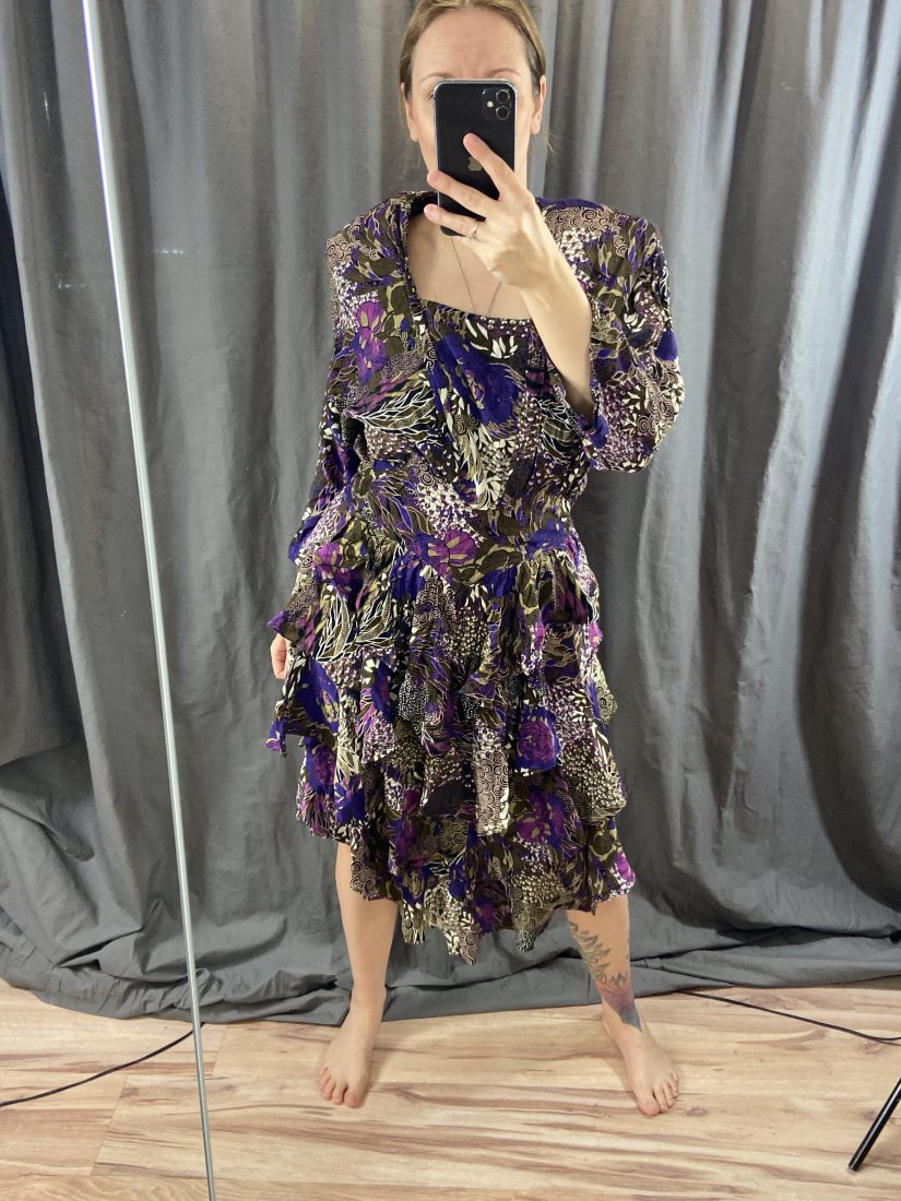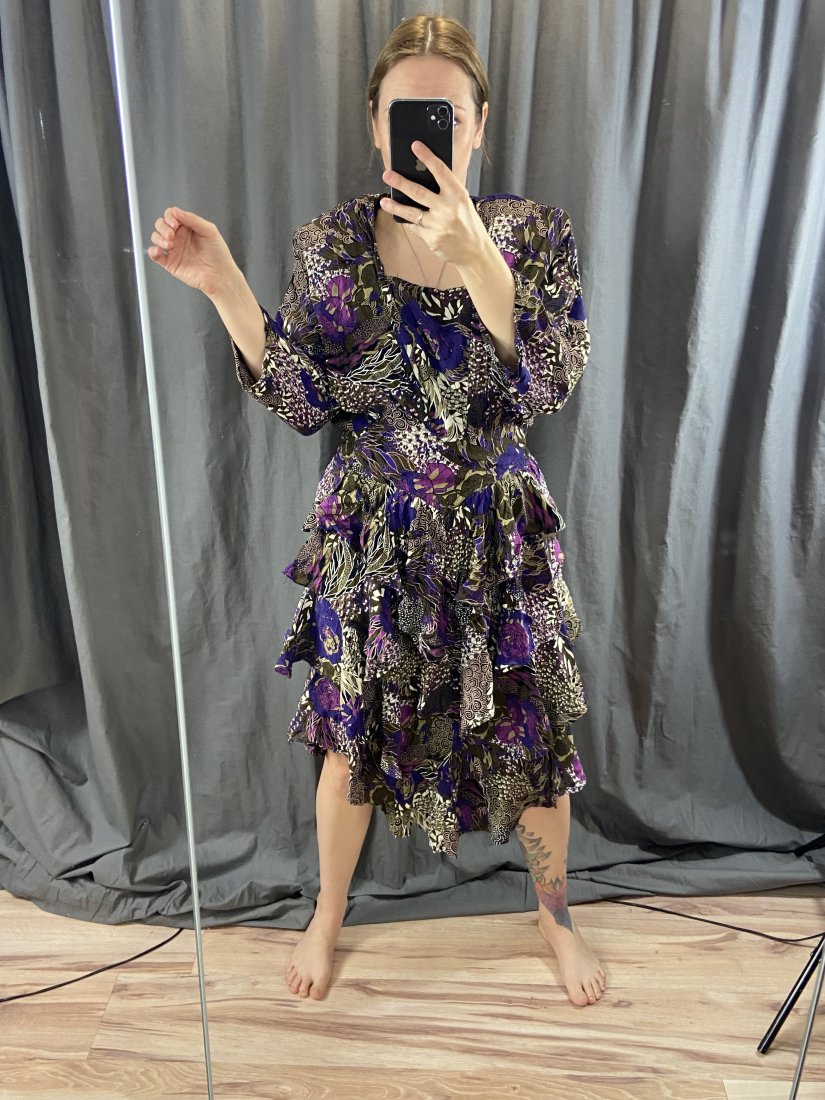 Wspaniała sukienka vintage, uszyta z wiskozy. Uszytek z Francji. Ma dość duże poduchy wszyte, ale można je usunąć.