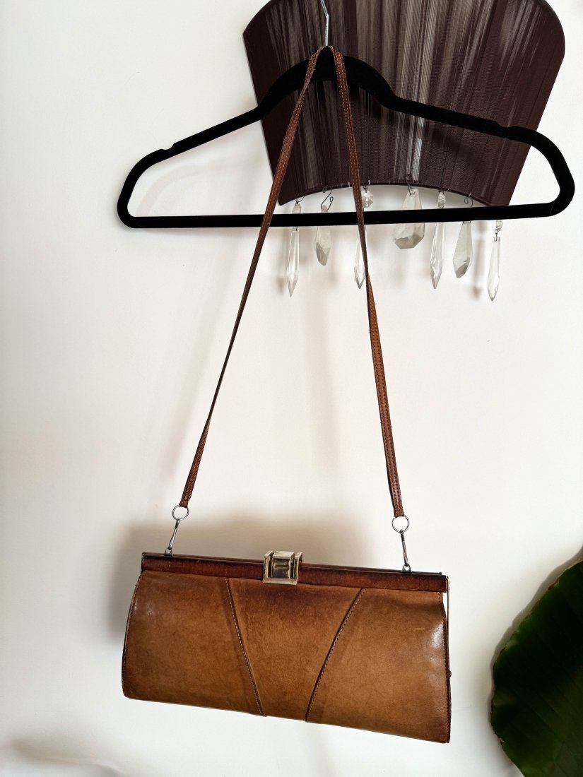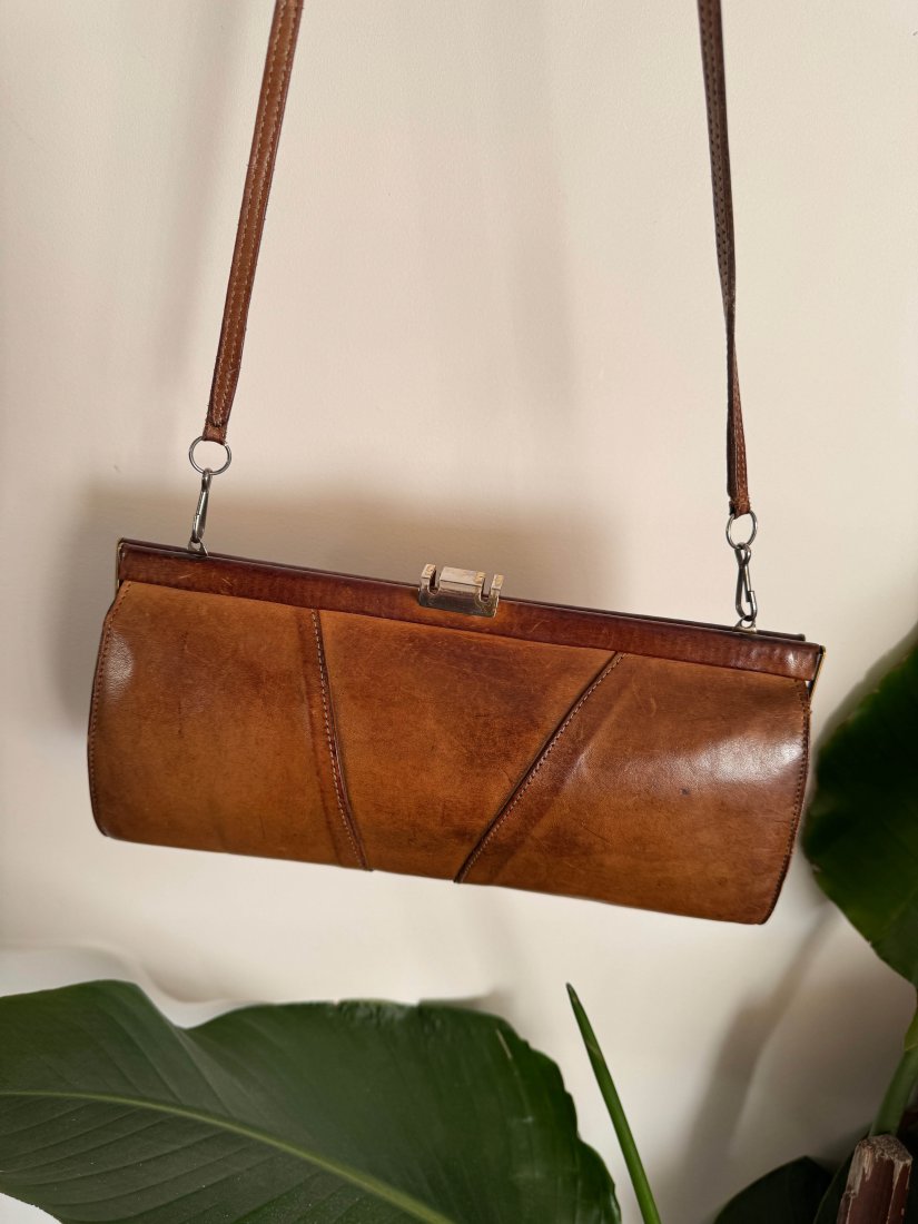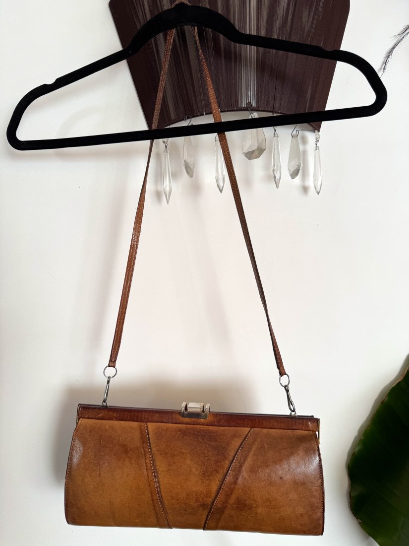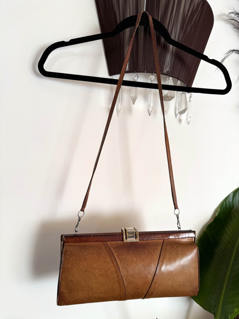 Oryginalna torebka/kopertówka z lat 80-tych ubiegłego wieku. Skóra! Odcień koniakowy. Odpinany pasek.