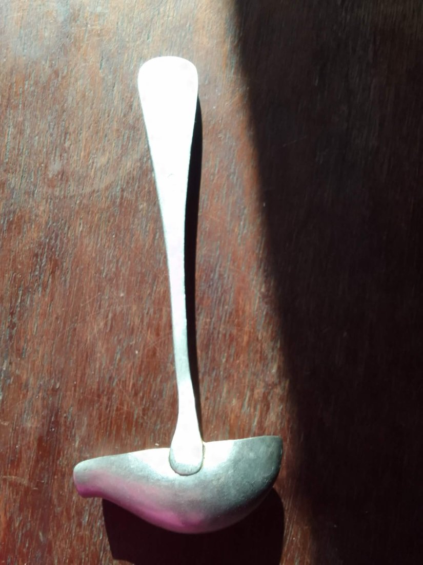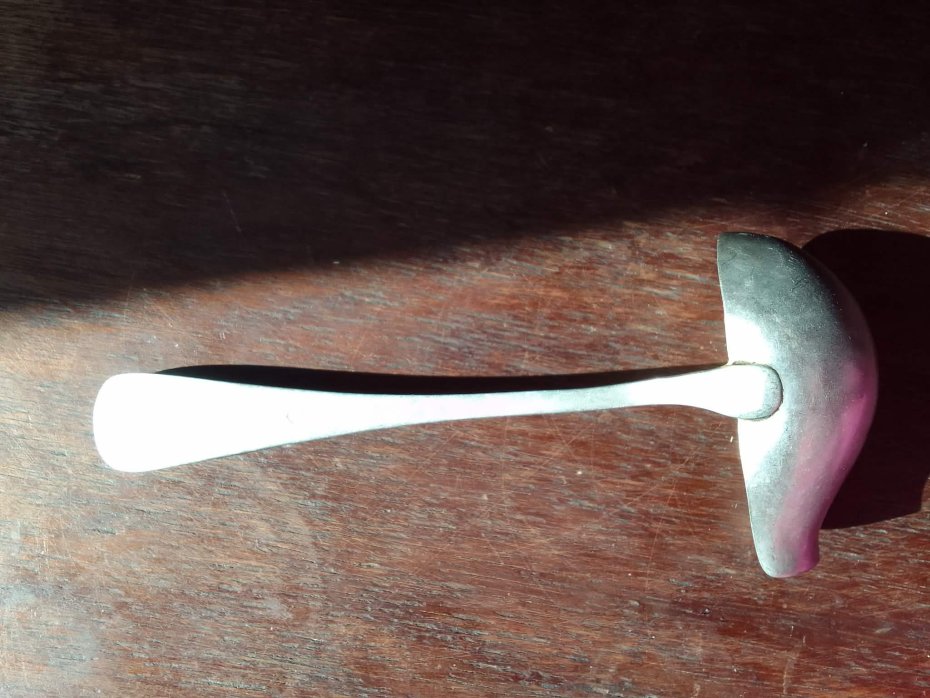 Metalowa łyżka wazowa o klasycznym, użytkowym designie. Czerpak (miseczka) posiada charakterystycznie wyprofilowany dzióbek, co ułatwia precyzyjne nalewanie sosów lub zup. Trzonek jest gładki, rozszerzający się ku górze, o minimalistycznej formie pozbawionej zbędnych zdobień, co jest typowe dla wzornictwa modernistycznego i przemysłowego połowy XX wieku. Na spodzie trzonka znajduje się wyraźna sygnatura: S.M.F., herb z literami W i S oraz napis ALPACCA.