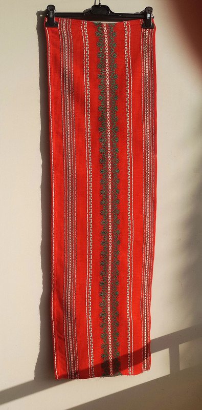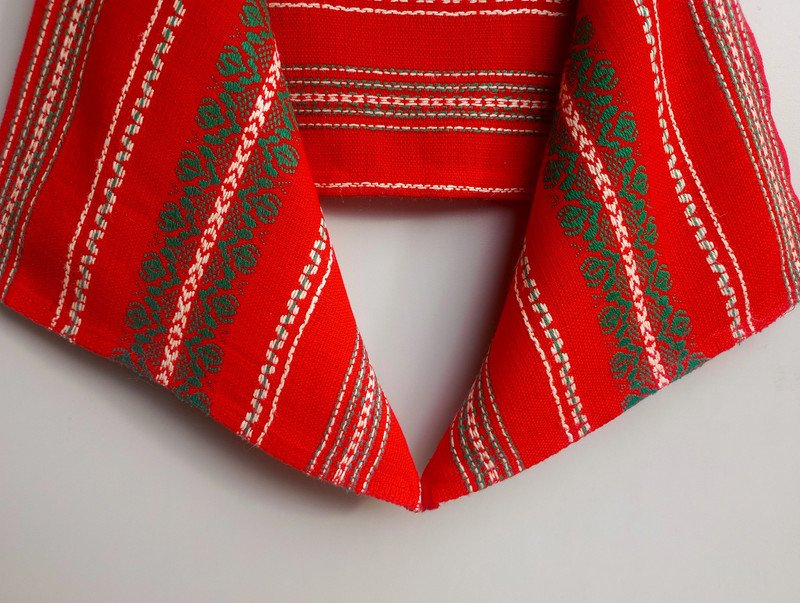 Tkana tkanina true vintage/retro (okres PRL-u) do wykorzystania jako element wystroju mieszkania. Kolorystyka: piękna żywa czerwień, biel i zieleń. W rzeczywistości odcień czerwieni jest najbardziej zbliżony do tego widocznego na ostatnim zdjęciu. W mojej galerii jest do kompletu taka sama tkanina, ale większych rozmiarów: