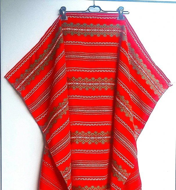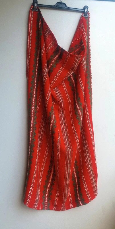 Tkana tkanina true vintage/retro (okres PRL) do wykorzystania jako element wystroju mieszkania. Kolorystyka: piękna żywa czerwień, biel i zieleń. Prawie żadne zdjęcie nie oddaje prawdziwego odcienia czerwieni. Nie jest to czerwień meksykańska (wpadająca w pomarańcz). Proszę się tym nie kierować. Odcień najbardziej zbliżony do rzeczywistego widać na ostatnim zdjęciu. W mojej galerii jest do kompletu taka sama tkanina, ale mniejszych rozmiarów: