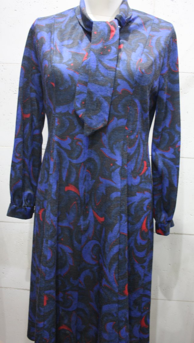 sukienka vintage we wzór paisley, zapinana z przodu na suwak, pod szyją wiązana, rękaw zapinany na guzik