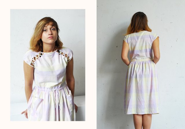 Sukienka vintage, w delikatnej, pastelowej tonacji, ozdobiona pięknymi wycieńciami na ramionach i u dołu.