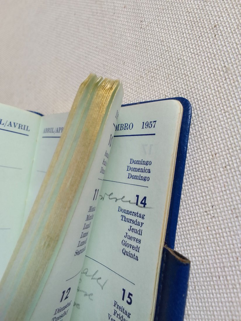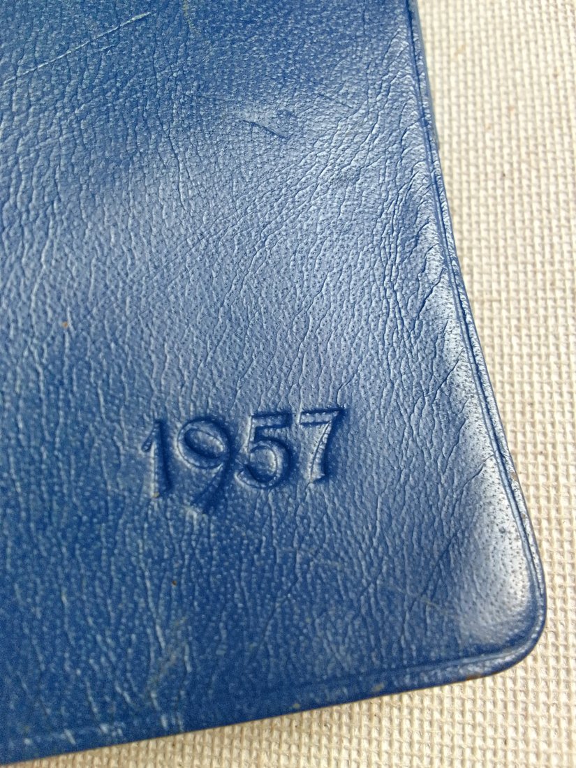 Unikatowy, vintage notes/kalendarzyk Lufthansa – 1957 r. | Skórzana oprawa | Pozłacane brzegi | Historyczna pamiątka lotnicza