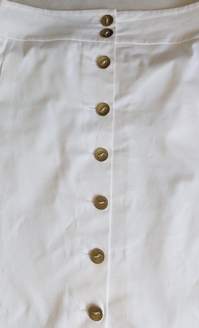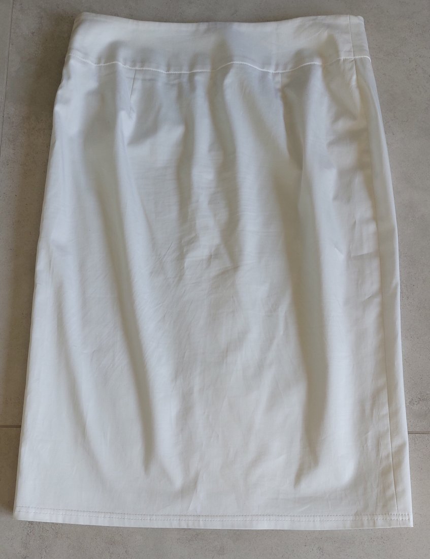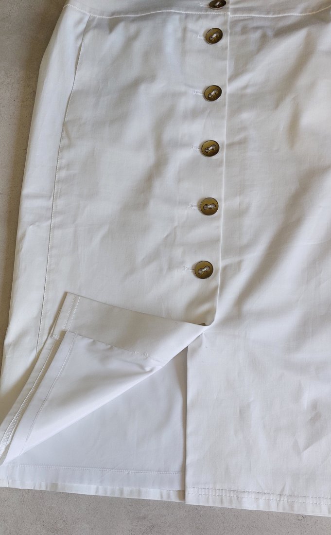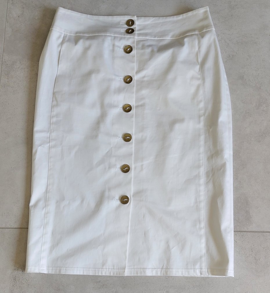 Spódnica zachowana w bardzo dobrym stanie, zapinana na guziki, wewnątrz podszewka. Skład: bawełna 97%, elastan 3%.