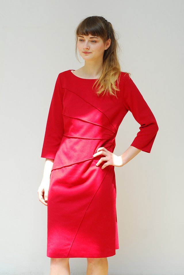 Czerwona sukienka z grubszej dzianiny, marszczona po bokach, rękawki 3/4, długość lekko za kolano.